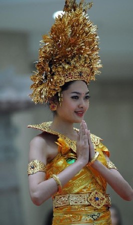 A model presents a creation in the opening ceremony of a costume exhibition of China and ASEAN in Chongqing Municipality, southwest China, Oct 10, 2011. [Photo/Xinhua]