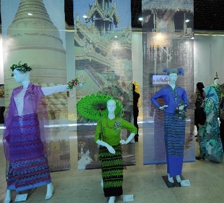 Visitors look at dresses during a costume exhibition of China and ASEAN in Chongqing Municipality, southwest China, Oct 10, 2011. [Photo/Xinhua]
