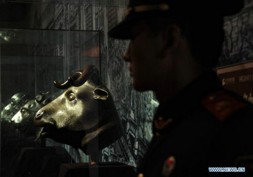 Photo taken on April 14, 2012 shows bronze head of bull exhibited during an exhibition of treasures of Yuanmingyuan and Buddha Sculptures of the Northern and Southern Dynasties in Harbin, capital of northeast China's Heilongjiang Province. (Xinhua/Wang Kai)