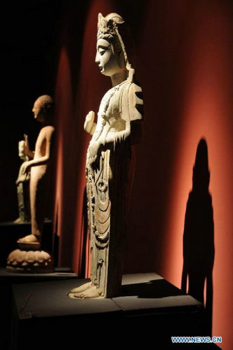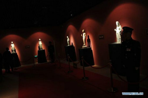 Photo taken on April 14, 2012 shows Buddha statues exhibited during an exhibition of treasures of Yuanmingyuan and Buddha Sculptures of the Northern and Southern Dynasties in Harbin, capital of northeast China's Heilongjiang Province. (Xinhua/Wang Kai)