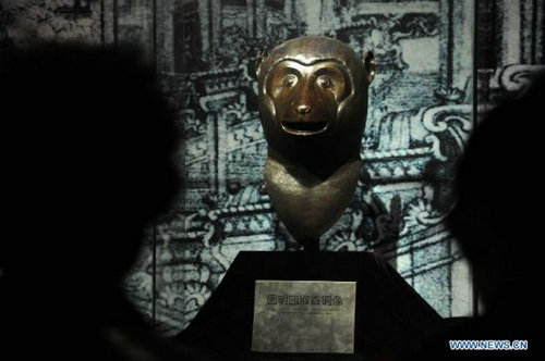 Photo taken on April 14, 2012 shows bronze head of moneky exhibited during an exhibition of treasures of Yuanmingyuan and Buddha Sculptures of the Northern and Southern Dynasties in Harbin, capital of northeast China's Heilongjiang Province. (Xinhua/Wang Kai)