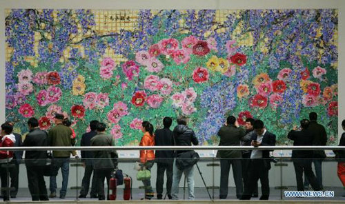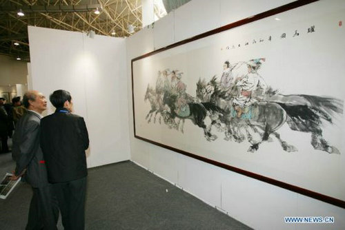 Visitors appreciate a picture at the 2nd Chinese Painting Festival held in Weifang, east China's Shandong Province, April 19, 2012. More than 1,200 artists' 4,000 Chinese paintings are on display. (Xinhua/Zhang Chi)