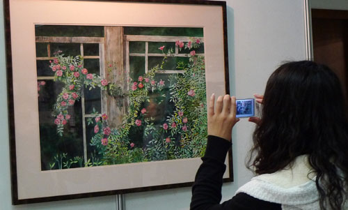 A female spectator takes a picture on Sunday, April 22, 2012, of a piece of artwork by Fanny Wong called "Roses outside the Window", the winning entry of the 2007 8th National Watercolor and Pastel Painting Exhibition". [Photo: CRIENGLISH.com/Xu Fei]