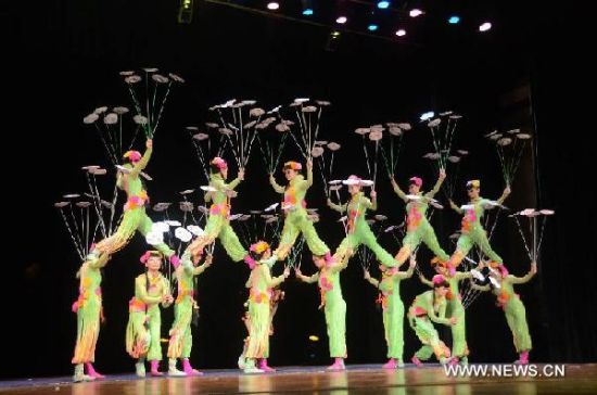 Acrobats from Chinese national acrobatic troupe perform "Umbrella Juggling" during a fund-raising show for Myanmar Library Foundation at the National Theatre in Yangon, Myanmar, April 29, 2012. Under the cultural exchange program of the two countries, the troupe will proceed to Nay Pyi Taw and give a charity show next Wednesday and to Mandalay next Friday and Saturday. (Xinhua/Jin Fei)