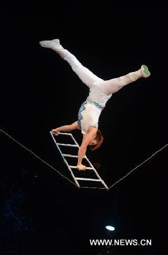 An acrobat from Chinese national acrobatic troupe performs "Slack Wire" during a fund-raising show for Myanmar Library Foundation at the National Theatre in Yangon, Myanmar, April 29, 2012. Under the cultural exchange program of the two countries, the troupe will proceed to Nay Pyi Taw and give a charity show next Wednesday and to Mandalay next Friday and Saturday. (Xinhua/Jin Fei)