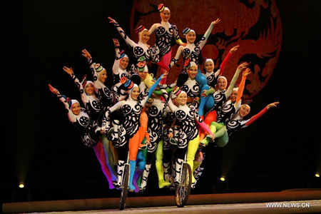 Chinese acrobats perform during the Grand China National Acrobatic Circus in Quezon City, the Philippines on May 8, 2012. The Chinese acrobats are in the country for the Legends of the Dragon show that will run from May 8 to 13. (Xinhua/Rouelle Umali)