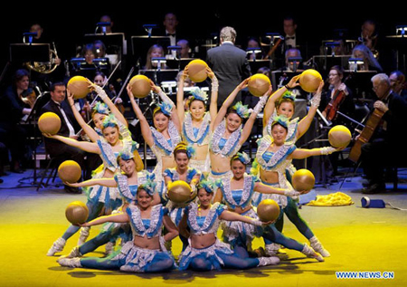 Acrobats (front) of China's Hunan Acrobatic Troupe perform with the Kitchener-Waterloo Symphony at the Sony Centre for the Performing Arts in Toronto, Canada, May 12, 2012. This creative collaboration is the first of its kind between a Chinese acrobatic troupe and a Western symphony orchestra. (Xinhua/Zou Zheng)