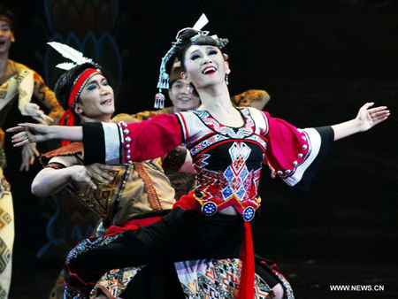 Dancers perform dance drama "Story of the Yi People" in Haikou, capital of south China's Hainan Province, May 29, 2012. The dance drama premiered on Wednesday told the history of the Yi people after immigrating to the Hainan Island. (Xinhua/Peng Tong)