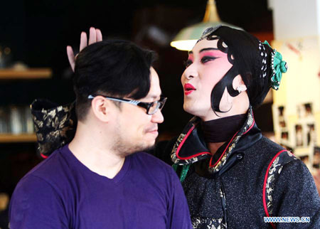 Liu Xinran (R), a Peking opera actor who plays female roles, performs "Cao Qiqiao", a modern Peking opera adapted from Eileen Zhang's novel "The Golden Cangue", in a breakfast restaurant in Xinbei City, southeast China's Taiwan, June 3, 2012. (Xinhua/Hou Dongtao)