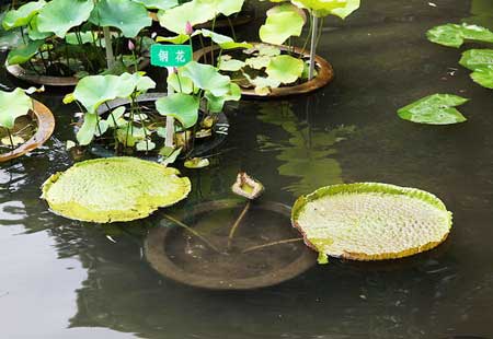 There are four exhibition sectors in the "Breeze-ruffled Lotus at Quyuan Garden" area: "Green lotus leaves welcome the guests", "the lotus pool of beauty and cheer", "lotus flowers with overflowing fragrance" and "cool wind blows over the lotus". The other exhibition area Guo Zhuang is the center of this year's lotus exhibition. In total, more than 410 kinds of lotus flowers and more than 20 kinds of water plants are displayed.