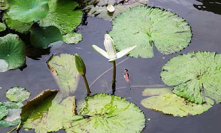 There are four exhibition sectors in the "Breeze-ruffled Lotus at Quyuan Garden" area: "Green lotus leaves welcome the guests", "the lotus pool of beauty and cheer", "lotus flowers with overflowing fragrance" and "cool wind blows over the lotus". The other exhibition area Guo Zhuang is the center of this year's lotus exhibition. In total, more than 410 kinds of lotus flowers and more than 20 kinds of water plants are displayed.