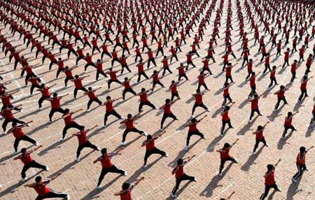 A total of 10,000 boys perform martial arts to celebrate China’s 7th Cultural Heritage Day in Tagou Wushu School in central China’s Henan Province on June 9, 2012. (Xinhua/ Zhu Xiang)