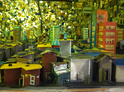 An amazing sculptural piece by Hema Upadhyay covered three sides and the roof of an 8 by 12 foot box with miniature buildings representing India’s towns and cities in remarkable detail. Light reflected off aluminum roofs and the brightly colored walls and tarpaulins that made up the miniature world.