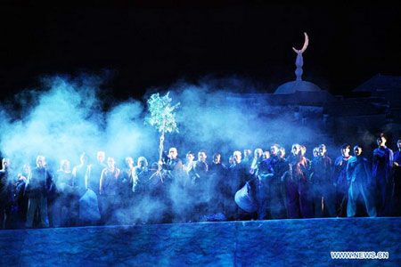 Actors perform on stage a Yuju Opera in Beijing, capital of China, July 2, 2012 as part of the fourth Minorities Art Festival of China. (Xinhua/Li Jing)