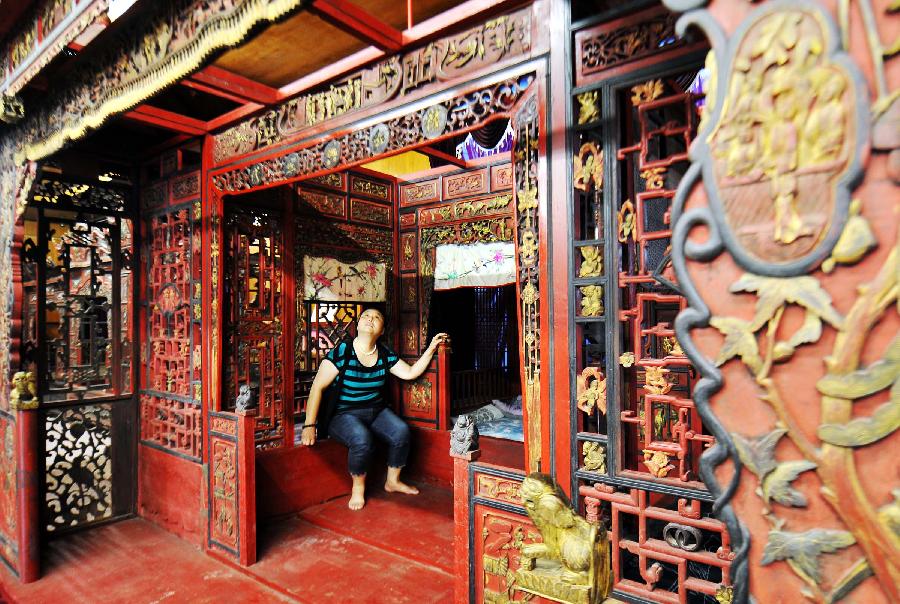 Collector Li Anhua views a carved wooden bed during an exhibition in Taoyuan County, central China's Hunan Province, July 26, 2012. A total of 100 exquisite beds dating back to the Ming (1368-1644) and Qing (1644-1911) dynasties had been collected by Li in the past over two decades. (Xinhua/Zhao Zhongzhi