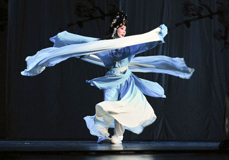 Qi Aiyun, a winner of China's highest theatrical award "Plum Blossom Prize", performs Shaanxi opera in Urumqi, capital of northwest China's Xinjiang Uygur Autonomous Region, Aug. 3, 2012. An art troupe consisted of winners of "Plum Blossom Prize" under China Federation of Literary and Art Circles performed 13 types of operas for audience in Urumqi on Friday. (Xinhua/Wang Fei)