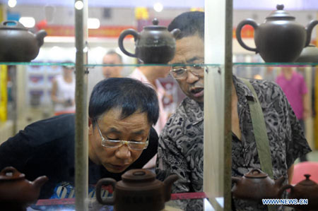 Two men look at boccaro teapots from Yixing, east China's Jiangsu Province at the 7th China Folk Art Fair in Changchun, capital of northeast China's Jilin Province, Aug. 3, 2012. The Fair, which kicked off on Friday, will last for six days at Changchun International Conference and Exhibition Center. (Xinhua/Lin Hong)