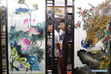People passes by embroidery screens at the 7th China Folk Art Fair in Changchun, capital of northeast China's Jilin Province, Aug. 3, 2012. The Fair, which kicked off on Friday, will last for six days at Changchun International Conference and Exhibition Center. (Xinhua/Lin Hong)