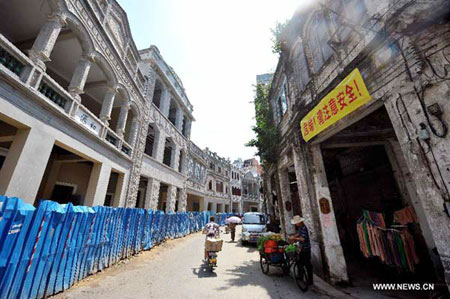 Photo taken on Aug. 14, 2012 shows reconstructed Qilou buildings (L) and that to be restored (R) in Qilou old street in Haikou, capital of south China's Hainan province. The first-phase restoration of ten Qilou buildings has been completed in Haikou recently. The Qilou old street, a famous street with a history of more than a century featuring multi-story southeast Asian style buildings integrating Chinese and European architectural styles, was listed as one of the Chinese famous historic streets.[Photo/Xinhua]