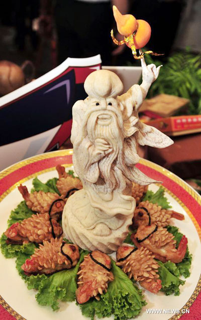 Photo taken on Aug. 15, 2012 shows a sculpture made of food at the press conference of 2012 Taiwan Culinary Exhibition in Taipei, southeast China's Taiwan. The 4-day long exhibition will kick off in Taipei on Aug. 17. (Xinhua/Wu Ching-teng)