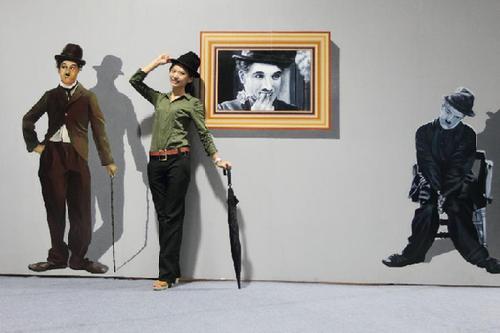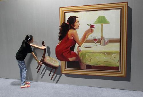 A girl poses for photo at a 3D exhibition in Bejing, capital of China, Aug. 18, 2012. Over 80 pieces of artworks created by South Korean artists are on display to celebrate the 20th anniversary of the establishment of diplomatic relations between China and South Korea. The exhibition will last till Sep. 9, 2012.