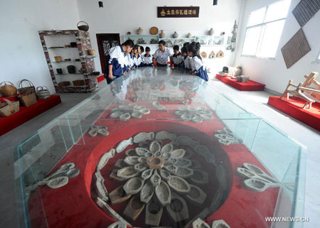 Middle school students view the pastry molds in an exhibition of people's daily items in past time at a museum in Zhoujiajian Town of Zizhou County, northwest China's Shaanxi Province, Aug. 22, 2012. (Xinhua/Yan Yan)