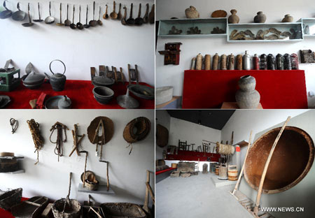 Combo photo taken on Aug. 22, 2012 shows the daily items used by people in past time in an exhibition at a museum in Zhoujiajian Town of Zizhou County, northwest China's Shaanxi Province. (Xinhua/Yan Yan)