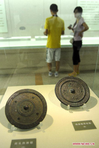Visitors view ancient bronze mirrors in an exhibition at the Jilin Provincial Museum in Changchun, capital of northeast China's Jilin Province, Aug. 24, 2012. A total of 163 ancient bronze mirrors from the Shaanxi History Museum in Xi'an, capital of northwest China's Shaanxi Province, were on display in the 55-day exhibition opening at the Jilin Provincial Museum on Friday. (Xinhua/Lin Hong)