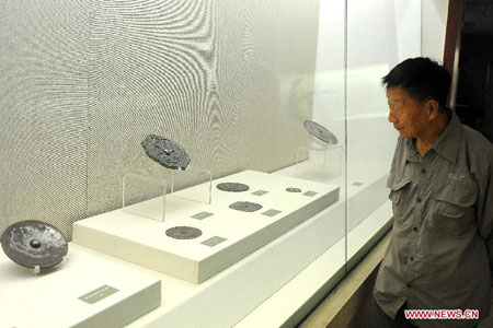 A visitor views ancient bronze mirrors in an exhibition at the Jilin Provincial Museum in Changchun, capital of northeast China's Jilin Province, Aug. 24, 2012. A total of 163 ancient bronze mirrors from the Shaanxi History Museum in Xi'an, capital of northwest China's Shaanxi Province, were on display in the 55-day exhibition opening at the Jilin Provincial Museum on Friday. (Xinhua/Lin Hong)