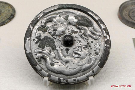 A bronze mirror of the Tang Dynasty (618-907) is displayed in an exhibition at the Jilin Provincial Museum in Changchun, capital of northeast China's Jilin Province, Aug. 24, 2012. A total of 163 ancient bronze mirrors from the Shaanxi History Museum in Xi'an, capital of northwest China's Shaanxi Province, were on display in the 55-day exhibition opening at the Jilin Provincial Museum on Friday. (Xinhua/Lin Hong)