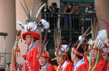 Heads of tribes of the Amis ethnic group gather at a ritual praying for good harvest, at a square in Xinbei City, southeast China's Taiwan, Sept. 9, 2012. (Xinhua/Yin Bogu)