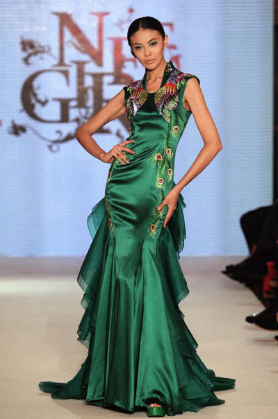 A model displays a creation of Chinese brand NE TIGER during the Milan Global Fashion Summit in Milan, capital of Italy, on Sept. 7, 2012. (Xinhua)