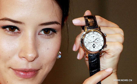 A model shows a watch during a media preview held by Sotheby's Hong Kong in Hong Kong, south China, Sept. 13, 2012. The auction house will present over 420 works worth at least 89 million HK dollars (11.5 million U.S. dollars) on its 2012 Fall Auction of Watches in Hong Kong on Oct. 8. (Xinhua/Jin Yi)