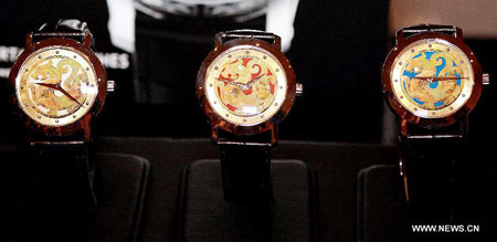 Photo taken on Sept. 13, 2012 shows enamel watches during a media preview held by Sotheby's Hong Kong in Hong Kong, south China. The auction house will present over 420 works worth at least 89 million HK dollars (11.5 million U.S. dollars) on its 2012 Fall Auction of Watches in Hong Kong on Oct. 8. (Xinhua/Jin Yi)