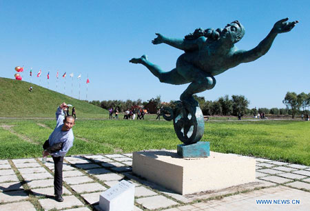 A citizen poses for a photo next to a sculpture at the 13th China Changchun International Sculpture Exhibition in Changchun, capital of northeast China's Jilin Province, Sept. 16, 2012. Some 400 sculptors from 102 countries and regions were involved in the event and 45 pieces of the 1,560 submissions were selected to show off in the exhibition on Sunday. (Xinhua/Xu Chang)
