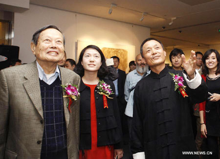 Painter Chao Hai (R, front) introduces his works to renowned scholar Yang Zhenning (L, front) during his solo exhibition in Beijing, capital of China, Oct. 9, 2012. The exhibition displayed Chao's 51 ink wash painting works that created over the past 12 years. (Xinhua/Wan Xiang)