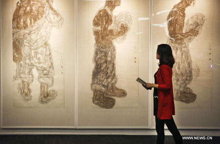 A visitor appreciates ink wash paintings during a solo exhibition of painter Chao Hai in Beijing, capital of China, Oct. 9, 2012. The exhibition displayed Chao's 51 ink wash painting works that created over the past 12 years. (Xinhua/Wan Xiang)