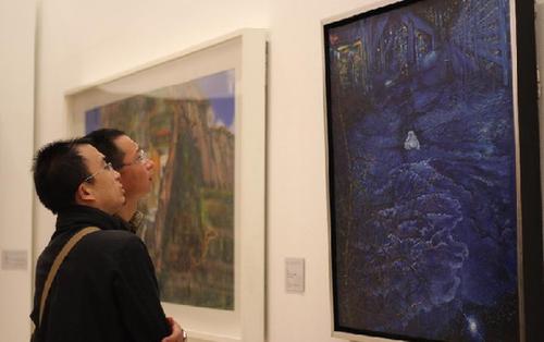 Two visitors appreciate painting works at the 5th China Beijing International Art Biennale at the National Art Museum of China in Beijing, capital of China, Oct. 11, 2012. Some 700 art works created by artists from 84 countries and regions were displayed at the exhibition that will last till Oct. 22.
