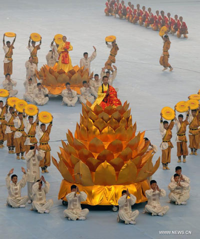 Artists perform during the opening ceremony of the 9th Zhengzhou International Shaolin Wushu Festival in Zhengzhou, capital of central China's Henan Province, Oct. 21, 2012. More than 1500 athletes all over the world took part in the 5-day festival, which kicked off here Sunday. (Xinhua/Li Bo)