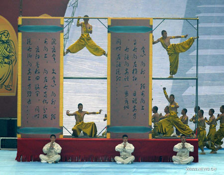 Artists perform during the opening ceremony of the 9th Zhengzhou International Shaolin Wushu Festival in Zhengzhou, capital of central China's Henan Province, Oct. 21, 2012. More than 1500 athletes all over the world took part in the 5-day festival, which kicked off here Sunday. (Xinhua/Li Bo)