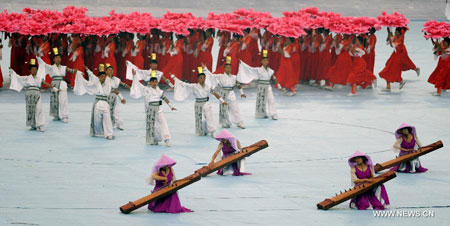 Artists perform during the opening ceremony of the 9th Zhengzhou International Shaolin Wushu Festival in Zhengzhou, capital of central China's Henan Province, Oct. 21, 2012. More than 1500 athletes all over the world took part in the 5-day festival, which kicked off here Sunday. (Xinhua/Li Bo)