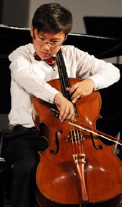 A cellist of Hong Kong plays a cello solo "Requiebros" by Gaspar Casado during a concert in Taipei, southeast China's Taiwan, Oct. 4, 2012. A concert by young musicians from the Chinese mainland, Taiwan, and south China's Hong Kong and Macao was held here on Sunday.