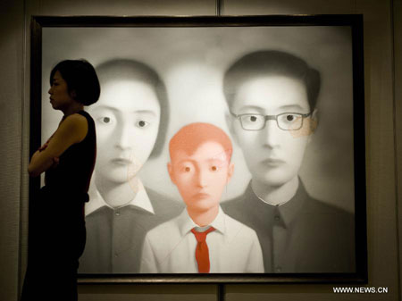 A staff member walks past an oil painting of Zhang Xiaogang on a press conference of the Christie's autumn auction preview event in south China's Hong Kong, Nov. 14, 2012. The auction will be held in Hong Kong from Nov. 24 to Nov. 28. (Xinhua/Lui Siu Wai)