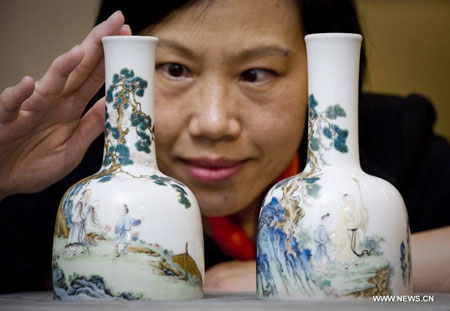 A staff member shows an artwork of Qing Dynasty (1644-1911), on a press conference of the Christie's autumn auction preview event in south China's Hong Kong, Nov. 14, 2012. The auction will be held in Hong Kong from Nov. 24 to Nov. 28. (Xinhua/Lui Siu Wai)