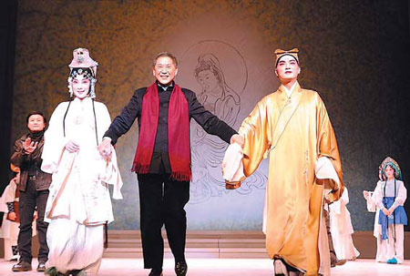 Kenneth Hsien-yung Pai (center) thanks the audience with two leading actors of The Jade Hairpin.