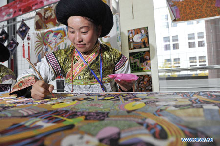 A contestant draws a painting during a competition showcasing handmade craftwork in Guiyang, capital of southwest China's Guizhou Province, Nov. 22, 2012. Some 200 craftsmen showed their skills in the event where exhibited over 570 creations of silverware, batik fabric, embroidery and traditional costumes. The three day competition kicked off here Wednesday. (Xinhua/Ou Dongqu)
