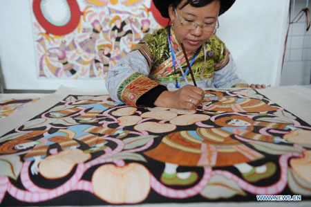 A contestant colours a painting during a competition showcasing handmade craftwork in Guiyang, capital of southwest China's Guizhou Province, Nov. 22, 2012. Some 200 craftsmen showed their skills in the event where exhibited over 570 creations of silverware, batik fabric, embroidery and traditional costumes. The three day competition kicked off here Wednesday. (Xinhua/Ou Dongqu)