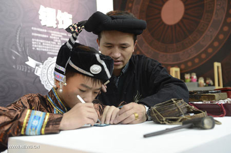 Li Zhengyun (R), the ninth generation of successors for silver-jeweleries-making from Miao ethnic group, instructs his son to make silver ornaments during the show of Guizhou National Folk Handicrafts in Beijing, capital of China, Nov. 21, 2012. (Xinhua/Li Jundong)