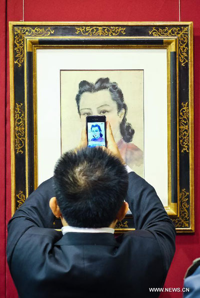 A man takes pictures of a painting displayed during the preview of Beijing Council 2012 Autumn Auction held in Beijing International Hotel Convention Center in Beijing, capital of China, Dec. 3, 2012. The preview, which kicked off on Sunday, showcased over 2500 artworks of different varieties such as paintings, chinaware and sculptures. The auction will last from Dec. 5 to Dec. 7. (Xinhua/Zhang Cheng)
