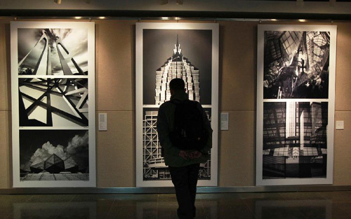 A man looks at pictures displayed at a photo exhibition on China's steel structure in the city library of east China's Shanghai Municipality, Dec. 5, 2012. The exhibition which kicked off on Wednesday will last until Dec. 9, 2012.